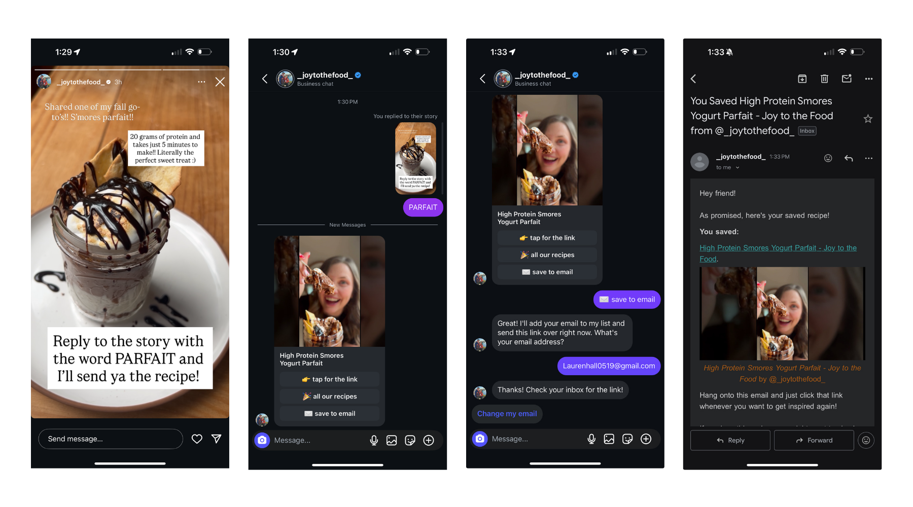 Here's how it works: When someone comments your keyword (like "recipe" or "save"), they instantly get a DM with the recipe link and an option to save it to their email. We're seeing about 5% of people who receive these DMs opt into email lists.